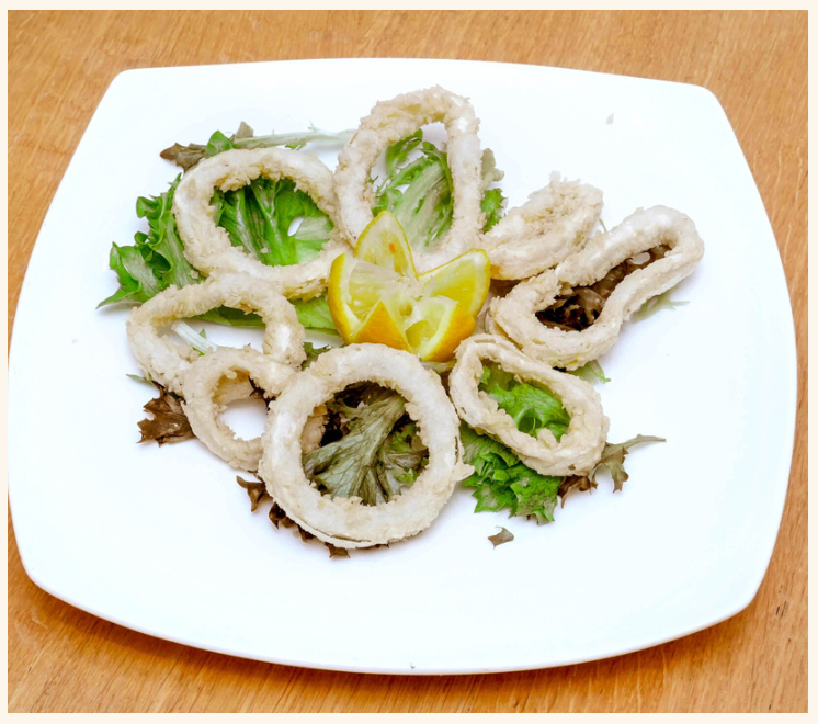 Lightly battered and fried calamari rings served with lemon.